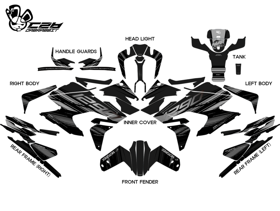 - Full Graphics kit included: Head light cover, Radiator shrouds, Front and Rear fender, Lower fork guards, Swing arms, Airbox, Gas tank and Cap, Rear side cover.
